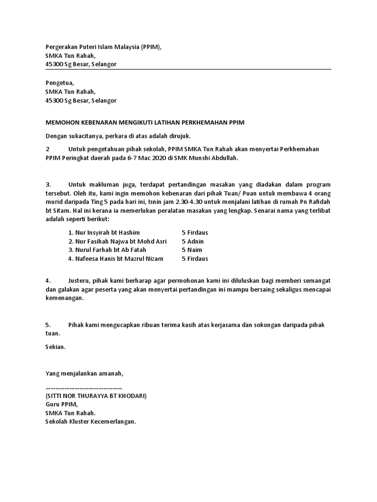 Tuliskan surat kepada ayah kamu untuk meminta kebenaran daripadanya. Selain itu surat izin juga memiliki kedudukan sebagai surat pemberitahuan juga kepada si penerima. Pohon bagi cadangan ipt kolej sesuai utk luar kampus jika saya.